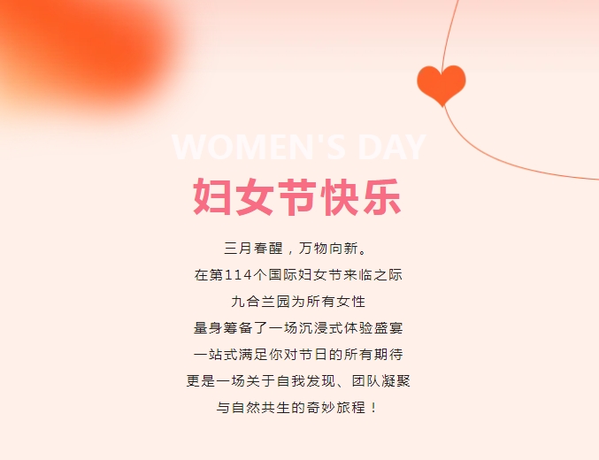 三月春醒,萬物向新。在第114個國際婦女節(jié)來臨之際九合蘭園為所有女性量身籌備了一場沉浸式體驗盛宴一站式滿足你對節(jié)日的所有期待更是一場關(guān)于自我發(fā)現(xiàn)、團隊凝聚與自然共生的奇妙旅…